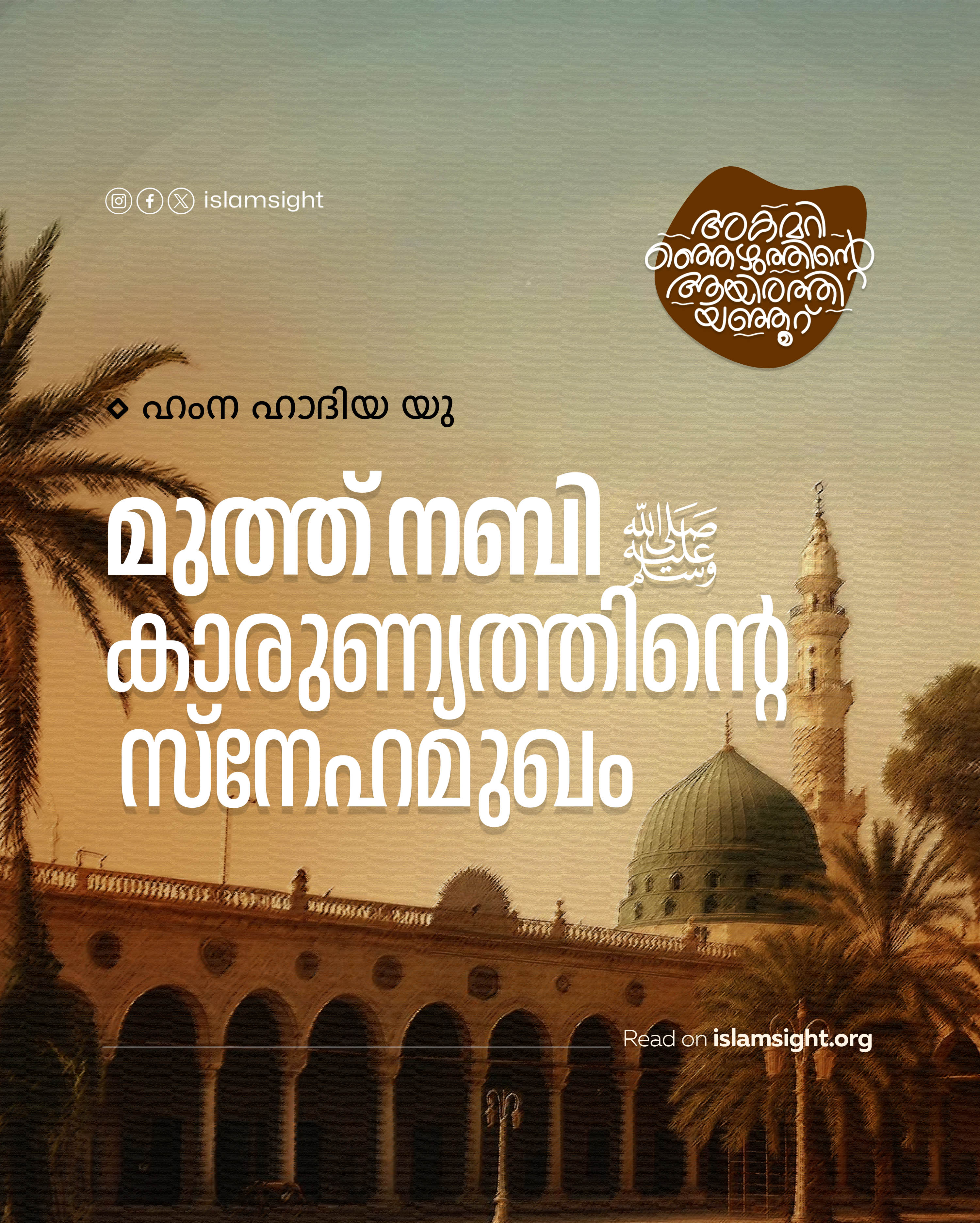 പെരുമാറ്റത്തിലും ഇടപെടലുകളിലും മുത്ത് നബി(ﷺ)യാണ് വിശ്വാസിക്ക് ആദ്യാവസാന മാതൃക. ആരെയും അലോസരപ്പെടുത്താത്ത മുഖഭാവത്തോടെ നർമം കലർത്തിയ വാക്കുകളോടെയായിരുന്നു തിരുദൂതരുടെ ഇടപെടൽ. ജീവിതത്തിൽ ഒരിക്കൽപോലും പരിഹാസവും കോപവും കാണിച്ചിട്ടില്ലാത്ത അതുല്യ വ്യക്തിത്വമാണ് റസൂൽ(സ)