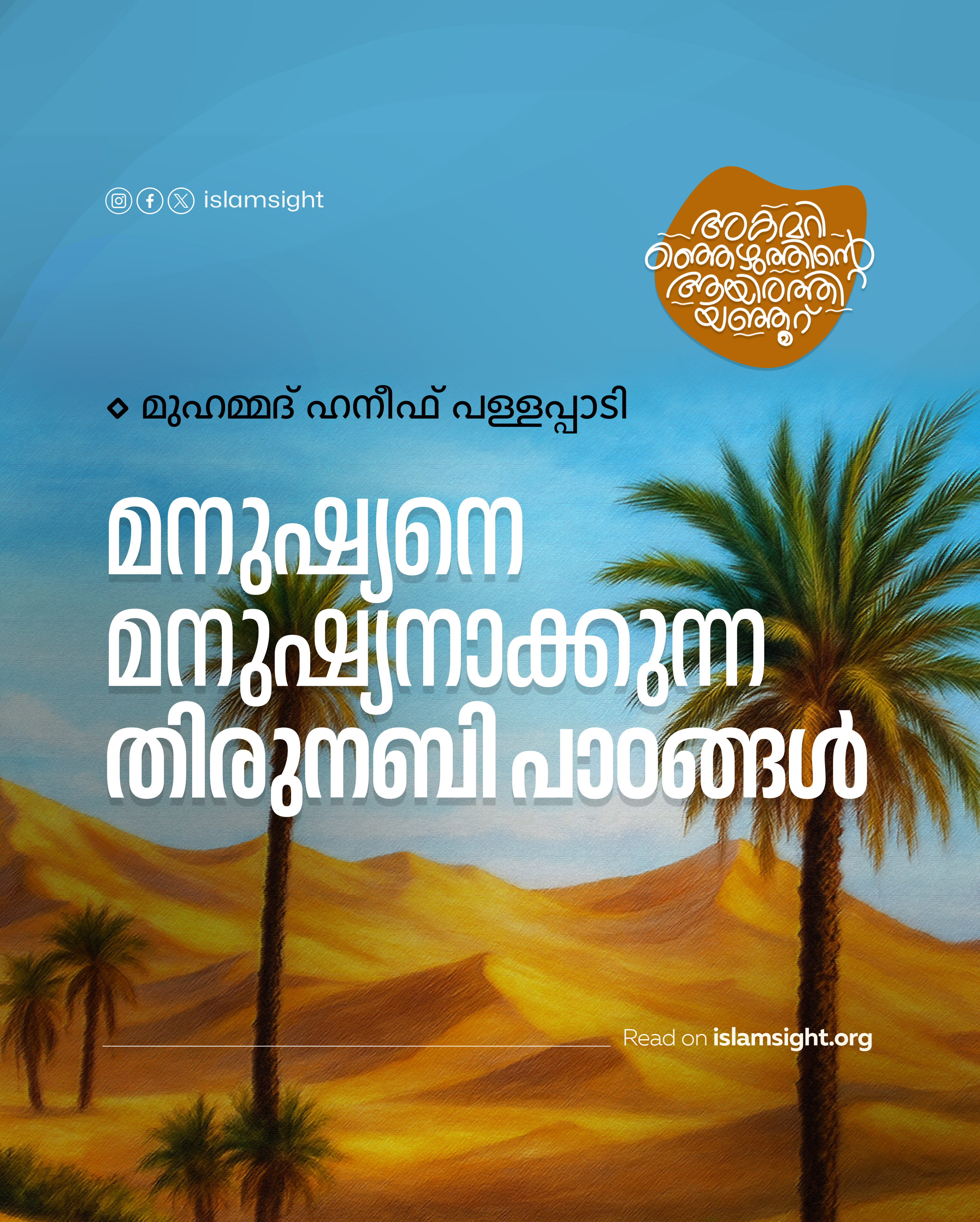 മുഹമ്മദ് നബി ﷺ യുടെ ജീവിതം കരുണ, നീതി, സഹിഷ്ണുത,സ്നേഹം എന്നിവയുടെ പ്രകാശഗോപുരമാണ്. അന്ധകാരത്തിലായിരുന്ന സമൂഹത്തെ വെളിച്ചത്തിലേക്ക് നയിച്ച റസൂൽ, മുഴുവൻ മനുഷ്യരാശിക്കും സമാധാനത്തിന്റെയും മാനവികതയുടെയും മാതൃകയായി തുടരുന്നു.