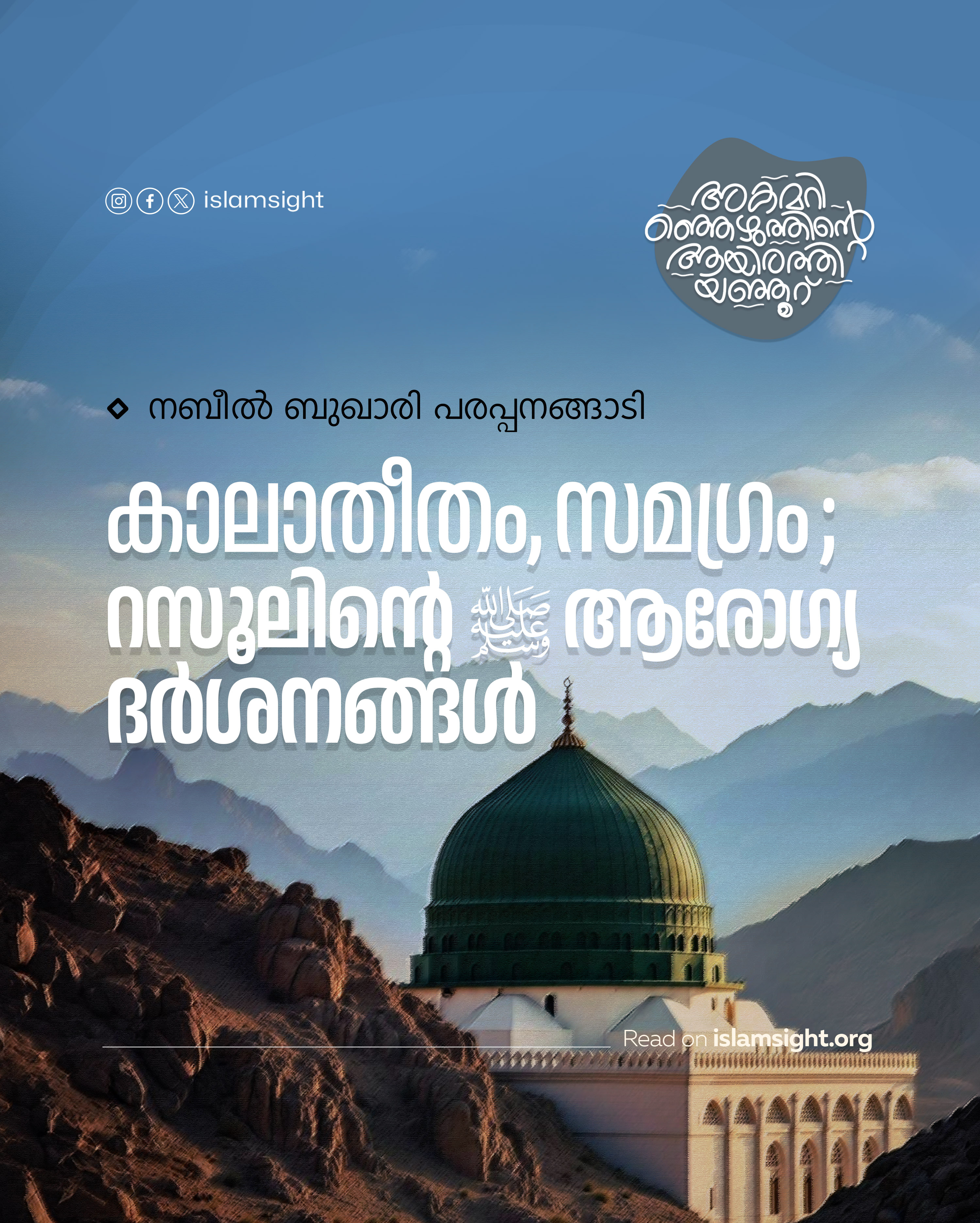 പ്രവാചകജീവിതം ആരോഗ്യത്തിനുള്ള സമഗ്ര പാഠമാണ്. ശുചിത്വവും മിതമായ ഭക്ഷണ രീതിയും പഠിപ്പിച്ചു. വ്യായാമത്തിനും ശാരീരിക ക്ഷമതയ്ക്കും പ്രാധാന്യം നൽകി. ദിക്റും പ്രാർത്ഥനയും മന:ശാന്തി നൽകുന്നുവെന്ന് തെളിയിച്ചു. പ്രകൃതിദത്ത ചികിത്സയും രോഗപ്രതിരോധവും ചേർത്ത് കാലാതീതമായ ഒരു ആരോഗ്യദർശനം രൂപപ്പെടുത്തി.