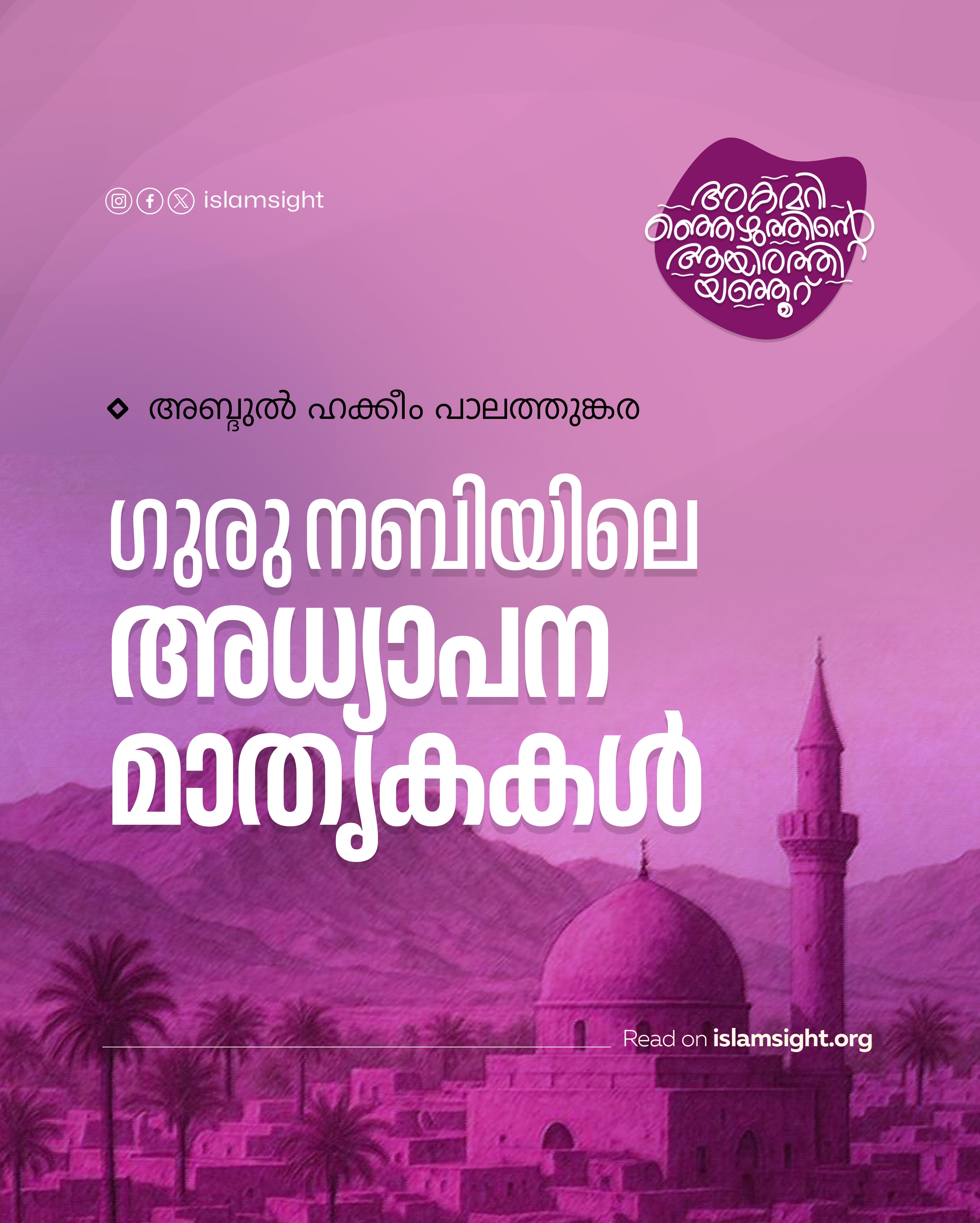 സംസ്കാര ബോധമില്ലാത്ത സമൂഹങ്ങളെ മികച്ച മാനവിക ആശയങ്ങൾ കൊണ്ട് സമ്പന്നമാക്കുകയും, ലോകത്തിനു തന്നെ മാതൃകാ സമൂഹമാക്കി അവരെ മാറ്റുകയും ചെയ്യുന്നതിൽ അധ്യാപകന് വലിയ പങ്കുണ്ട്. ആ കർത്തവ്യമാണ് ഗുരു ശ്രേഷ്ഠർ തിരു നബിയി(സ)യിലൂടെ നമുക്ക് നിഴലിച്ചു കാണാൻ കഴിയുന്നത്. സ്ത്രീയെ കേവലം ഉപഭോഗ വസ്തുവായിക്കണ്ട, അശ്ലീലങ്ങളാൽ വീർപ്പു മുട്ടി, ഉച്ച നീചത്വങ്ങൾ നടമാടിയിരുന്ന സമൂഹത്തിലുള്ളവരെ മികച്ച അധ്യാപന വൃത്തിയിലൂടെ കൂടുതൽ സദ്വൃത്തരാക്കി തീർക്കുകയായിരുന്നു തിരു നബി(സ). അതിന്റെ പ്രതിഫലനമായാണ് ആ വിധമുള്ള സമൂഹത്തിൽ നിന്നും നക്ഷത്ര തുല്യരായ മഹത്തുക്കൾ പിറവിയെടുക്കുന്നത്.